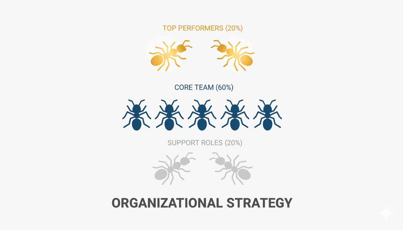 勤勉の代名詞のように言われるアリの群れを観察してみると、よく働くアリは全体の2割、そこそこ働くアリは6割、まったく働かないアリが2割になります。これが別名「2・6・2の法則」と呼ばれる理由です。