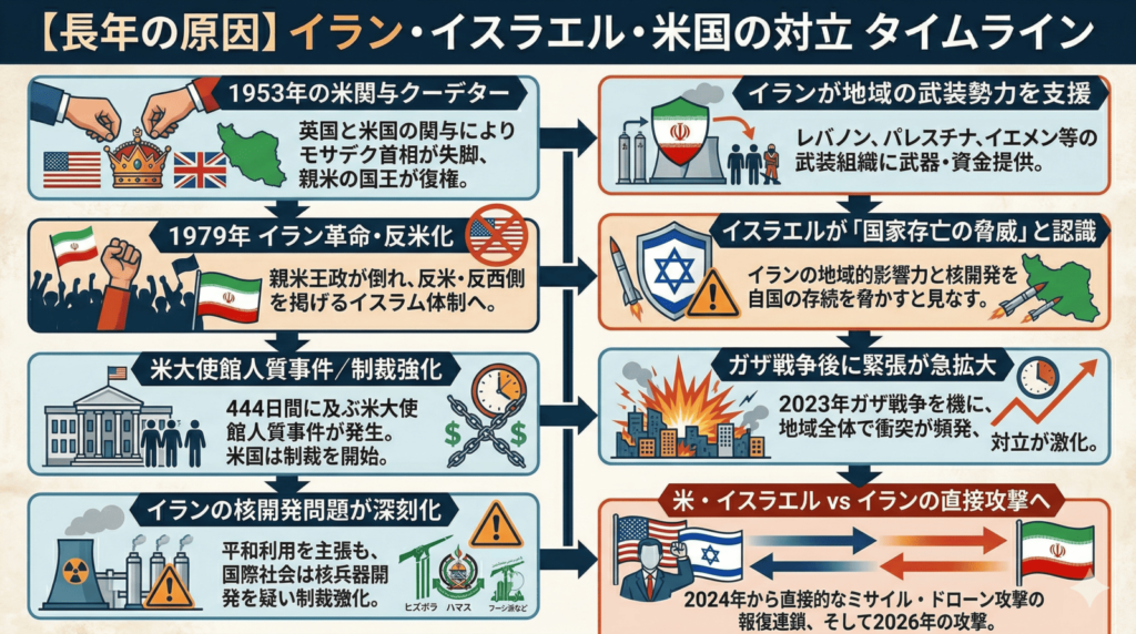 この対立は突然始まったものではなく、数十年続いてきた不信感・安全保障上の脅威・核問題が積み重なって、ついに大きな軍事衝突へ発展したものです。