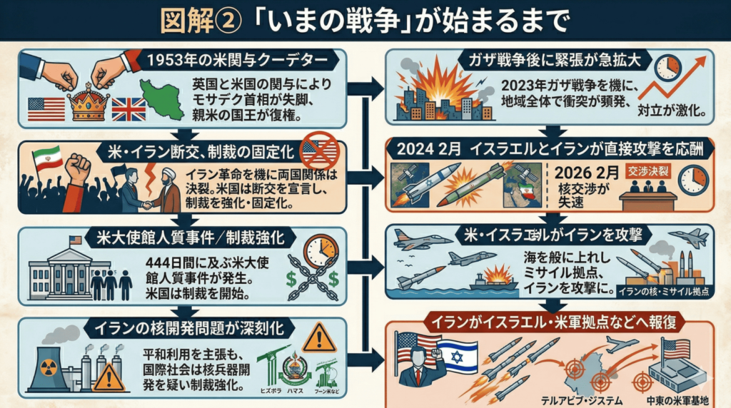 「この戦争はいつ始まったのか」と聞かれると、実は答えは1つではありません。長期的な始まりは1979年革命以降の対立であり、直接の軍事衝突としての始まりは2024年以降の報復の連鎖、そして現在の本格戦争の開始は2026年2月28日の米・イスラエルによる攻撃です。