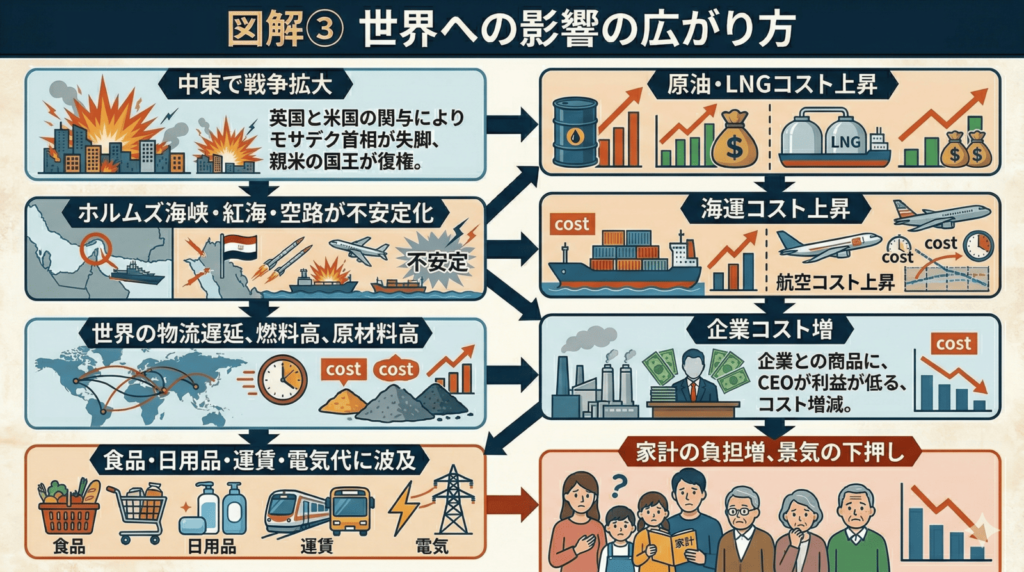 世界への影響は、単なる「遠い戦争」ではありません。ホルムズ海峡を通る石油とLNG、紅海・スエズの物流、航空路、原材料供給が揺らぐことで、世界の物価と景気を押し下げます。特にエネルギー輸入国には重い打撃です。