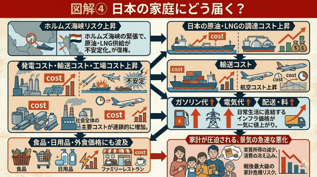 「中東が不安定 → 原油・ガスが高くなる → 日本の輸入コストが上がる → ガソリン・電気・物流・製造コストが上がる → 家計に跳ね返る」